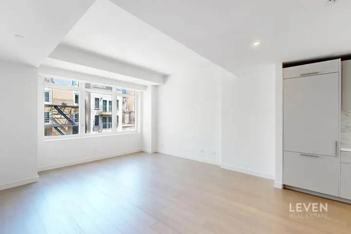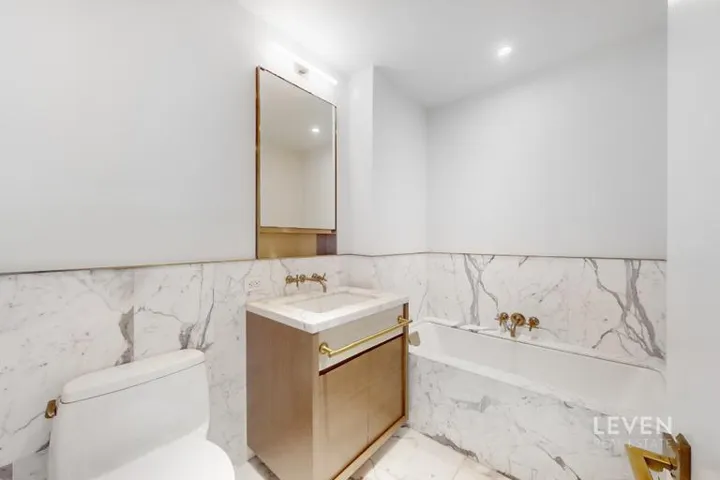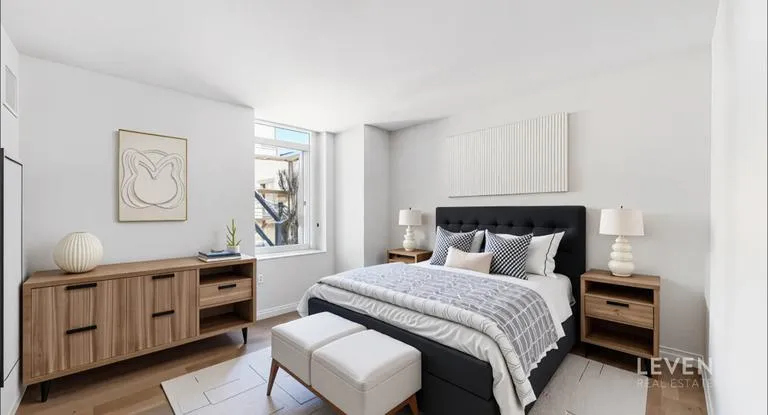 Step inside this sleek and modern residence spanning 843 square feet, where luxury meets comfort. The interior, designed by S. Russell Groves, offers a perfect blend of style and functionality. The unit features top-notch amenities including a custom POLIFORM kitchen, adorned with Calacatta Gold marble countertops, a convenient breakfast bar, and top-of-the-line Miele appliances. The spa-like bathroom is outfitted with luxurious white statuary marble, bronze fixtures, a deep soaking tub & separate shower, and radiant heated floors. Additional highlights include nearly 10-foot ceilings, North-facing wall-to-wall double-pane windows that bathe the home in natural light, in-unit washer/dryer, and rich smoked oak flooring throughout.