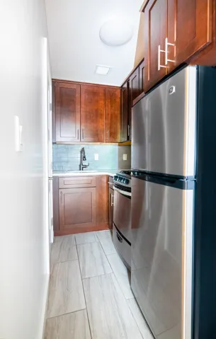 Elegant Interiors: Recently renovated kitchen with stainless steel appliances and hardwood floors.