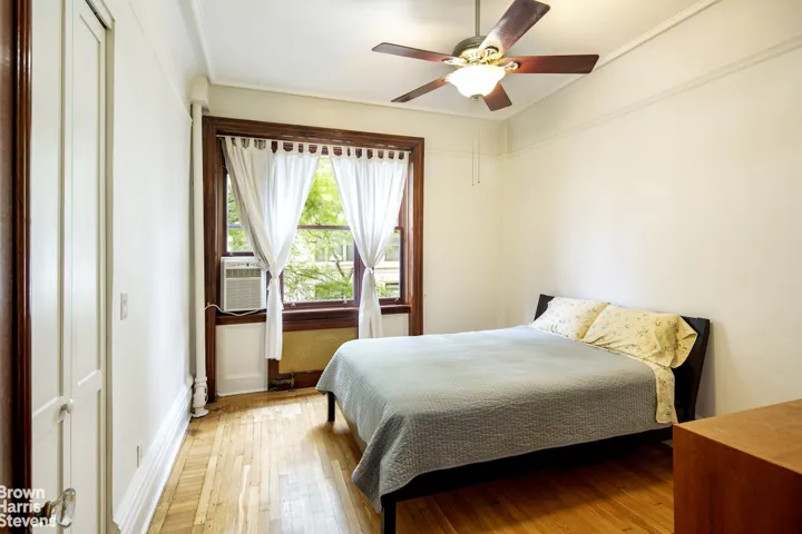 Located on the 2nd floor, this thoughtfully designed apartment combines classic pre-war elegance with modern convenience. Soaring 10-foot ceilings and refurbished hardwood floors with original mahogany inlay create a warm, inviting ambiance, while oversized, whisper-quiet windows frame picturesque, tree-lined views of 114th Street. The open kitchen is a chef’s dream, featuring a sleek Smeg oven and range, custom cabinetry, a wood-paneled Miele dishwasher, and a moveable island for flexible entertaining. A Liebherr refrigerator adds a touch of luxury, and the ceiling fan in the living room ensures refreshing air circulation year-round. Generous closets offer ample storage, and W/Ds are permitted with board approval. Best of all, the owner has already covered the assessment for ongoing capital improvements, making this home a turnkey opportunity in a friendly, well-maintained building.