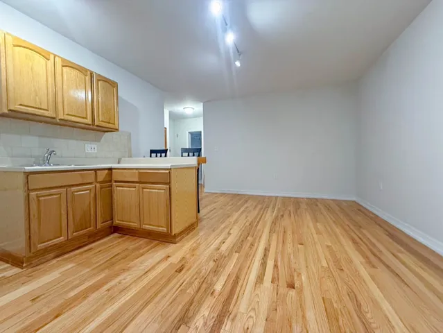 Living Room with open plan kitchen and breakfast bar with chairs. Large bedroom with two windows and a double closet. Laundry access to a building around the corner. Walk-up building on 2nd floor.