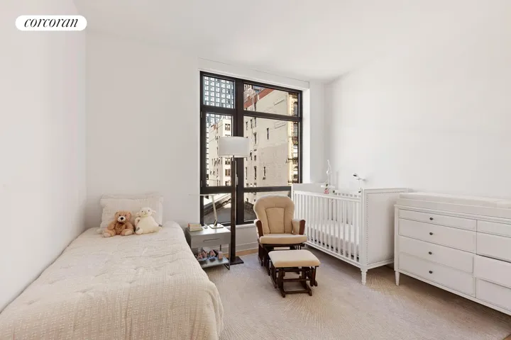The similarly spacious second bedroom faces north with open light and city views. The adjacent bathroom comes complete with a custom Italian vanity and Bianco Carrara countertop.