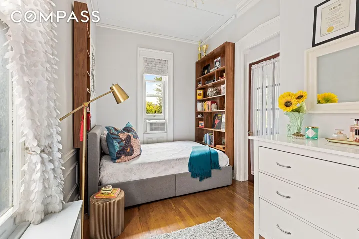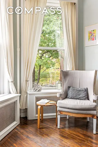 Relive the 2nd grade in this former mansion turned schoolhouse turned co-op building on the “Gold Coast” of Clinton Hill, Brooklyn. This unique duplex apartment features the charm of Victorian Brooklyn throughout. High ceilings, a gorgeous wood-burning fireplace, original floors, decorative moldings adorn the space facing the quiet back of the building. With three exposures the lower level gets exceptional lighting and has lovely tree-lined views. The windowed kitchen has butcher block countertops, abundant cabinet space and a charming farmhouse sink. The large living room is centered on the ornate fireplace, yet has room for a home office space as well. A dining area adjacent to the kitchen boasts stylish lighting and room to host friends and family. An outdoor terrace off the living room allows for lovely al fresco dining or lounging. The secondary bedroom is located off of the living room and features two exposures with extra large windows. An en-suite full bathroom has been recently renovated with classic Carrara marble tile.