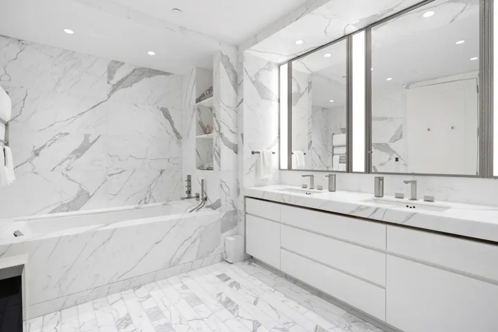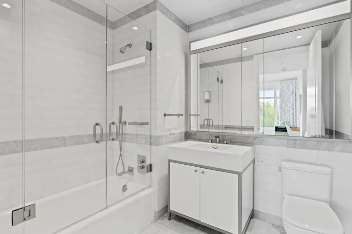The oversized Master bedroom suite has unobstructed river park views and features generously sized custom fitted closet space as well as custom storage built-out. The master bathroom is clad in Statuary Monarch marble, which plays and blends seamlessly with the custom hand-polished vanity, finished in white lacquer. The bathroom features radiant in-floor heating, a custom-designed horizontal fluted glass shower and toilet, a Kohler soaking tub, and Rettangolo Gessi faucets and fixtures.