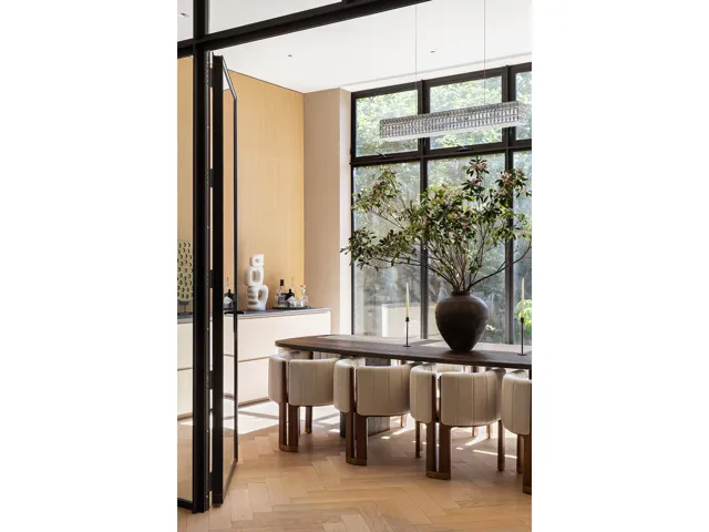 Ascend the stately stoop and step inside, where a gracious entry hall leads to a breathtaking formal living room featuring soaring ceilings nearly 12′ tall, floor-to-ceiling windows, and a striking fireplace. The spacious floor is finished with a sophisticated formal dining room, offering dramatic views through a full wall of windows, overlooking the serene garden below – an entertainer’s dream.