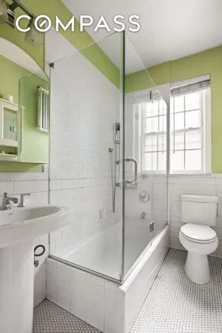 Upon stepping off the elevator on the 6th floor, you’re welcomed by an entry hallway leading to two spacious bedrooms. The primary bedroom is bathed in natural light from its southern and western windows and includes a generous closet. The windowed bathroom is appointed with classic subway and penny tiles, a glass-enclosed shower/bathtub, and chrome fixtures.