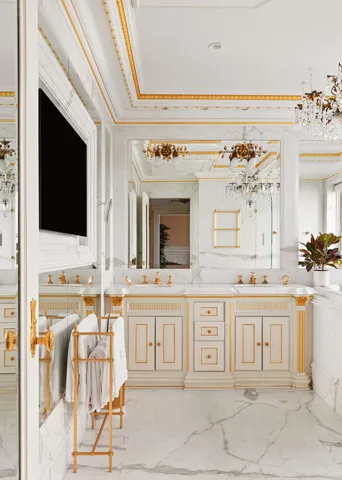 The primary suite is a sanctuary unto itself with a spa-like marble bathroom featuring a sculptural soaking tub and dual vanities, complemented by voluminous hidden closets and discreet dressing areas. From cleverly concealed doors that allow for an open concept layout or complete privacy, to double kitchens, double washer-dryers, and fully integrated storage, every detail has been executed without compromise.