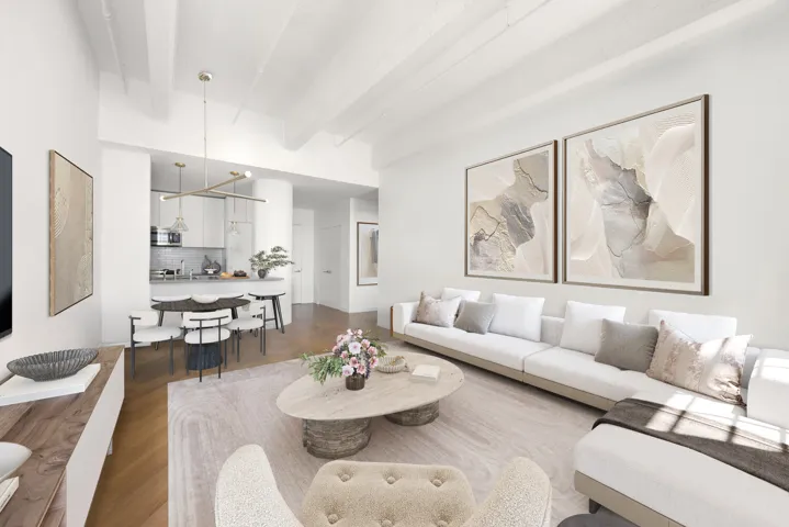 Step into iconic loft living at Austin Nichols House: soaring beamed ceilings, oversized steel-casement windows, original columns, and herringbone, tobacco-smoked oak flooring set a warm, refined tone. The large open living/dining area flows into a chef’s kitchen with custom white cabinetry, brushed concrete-look Caesarstone slab countertops, and panel-integrated premium appliances: Dacor refrigerator, Bertazzoni gas range & microwave, Asko dishwasher, plus an in-unit all-in-one washer/dryer for effortless convenience.