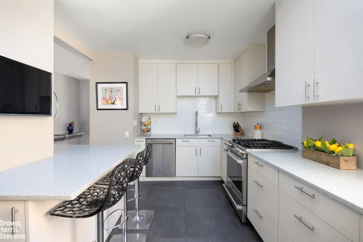 Off a semi private landing, enter this fabulous home. The windowed gourmet chef’s eat in kitchen is located in the perfect spot, close to everything, yet away from your guests! It has been newly renovated with Silestone Natural Quartz countertops in moonstone color, GE Caf appliances, stunning new white chocolate cabinetry with soft close doors and drawers with full extension, and porcelain cold strada natural floor tiles.
