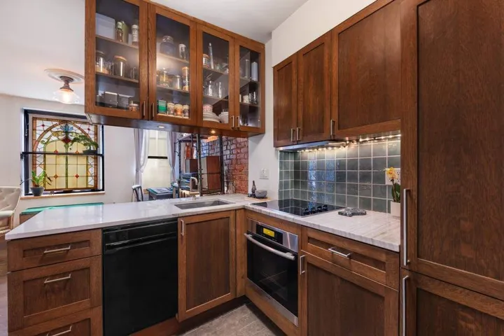 The open kitchen is a chef’s delight, featuring striking quartzite countertops, custom oak cabinetry, and Miele appliances, including a paneled refrigerator that seamlessly blends into the design. The bedroom is lined with built-ins and abundant storage, while the elegantly renovated bathroom offers a tub-shower combination, tiled walls and floors, and a vanity with additional storage. Hardwood floors, well-placed closets, and dimmable lighting complete the home’s thoughtful touches.