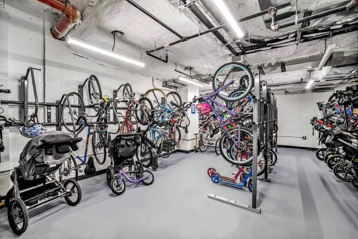 All three-bedroom flooded with sunlight from the southern exposure. The primary bedroom features a walk-in closet and a five-fixture bathroom with a luxurious soaking tub, separate glass shower, Gris de Savoie floors with radiant heat, and a double vanity with polished chrome Dornbracht fixtures. Two additional bedrooms are well proportioned.