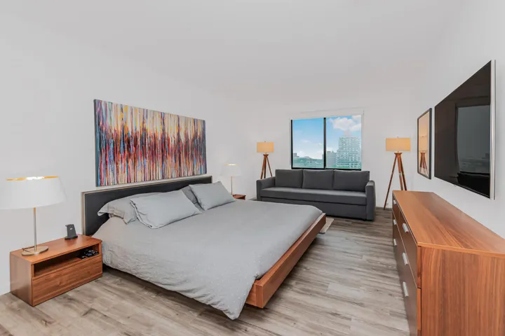 A beautiful open concept kitchen/living& dining space. The apartment boasts an Expansive view with all windows looking out towards Queens and parts of NYC. Tons of light pour in every morning . Beautiful shades adorn all of the windows with a remote control which can open, raise and also lower them when needed. There are 2 walk in closets(one currently is an office that you can hide when the doors are closed) plus 3 other large ones. The renovated open kitchen has a counter at one end with stools and cabinets. Stainless steel appliances and white tiled walls. The bathroom has a new pedestal sink and mirrored cabinet above.