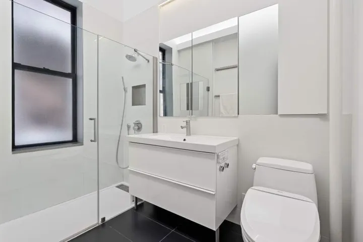 – Windowed bath with modern finishes: Flush mount shower base with glass door, Toilet with bidet seat