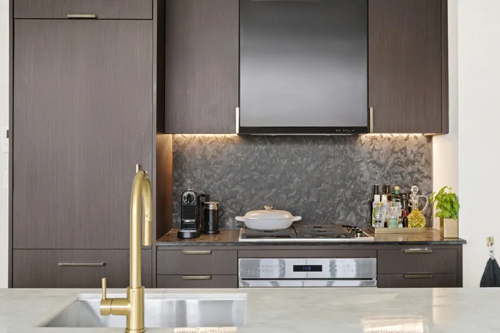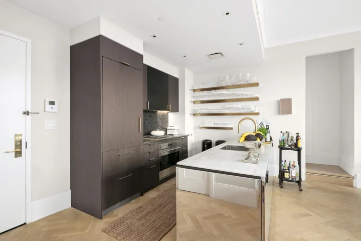 The bright, open-concept living space is anchored by a top-of-the-line Chef’s Kitchen, equipped with premium appliances including a Sub-Zero refrigerator and wine cooler, stainless steel Wolf oven with 4-burner gas range, Bosch dishwasher, Sharp microwave, and in-unit Bosch washer/dryer. Marble countertops, a stone backsplash, brass fixtures, and ample custom cabinetry complete this elegant culinary space.