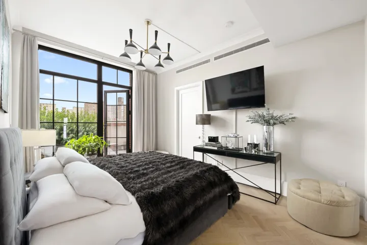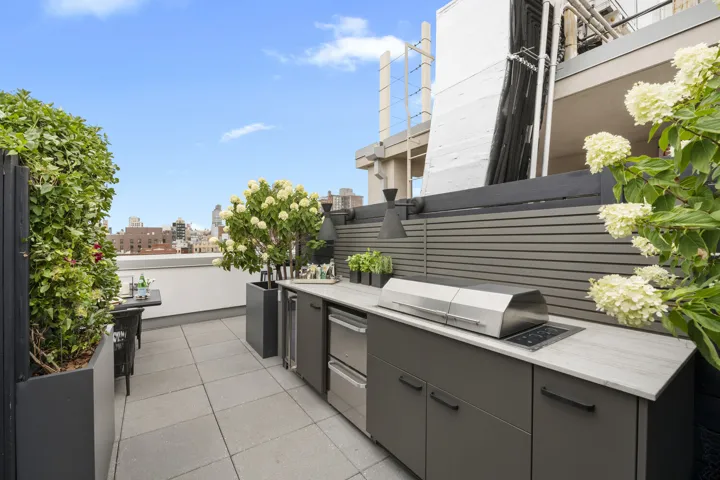 In the sun-filled Living Room, oversized casement windows frame tranquil Eastern views, while herringbone hardwood floors and high ceilings enhance the sophisticated ambiance. A stunning hardwood staircase leads to your private, landscaped rooftop terrace-an entertainer’s dream with an outdoor kitchen, electric grill, wine fridge, and built-in cold storage, all set against sweeping city vistas.