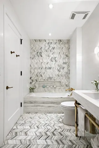 The spacious Primary Suite is a true sanctuary, featuring a custom walk-in closet, high ceilings, and herringbone hardwood floors. The en-suite bathroom boasts a double brass and marble vanity, a deep soaking tub, a walk-in rainforest shower, and exquisite marble tile work. French doors provide direct access to the large eastern-facing terrace, which spans the length of both bedrooms, offering privacy and serene outdoor space, perfect for a morning espresso or evening aperitif in true European style.