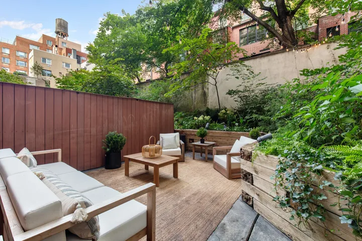 The main floor features a bright, open living and dining area with oversized windows and a sleek modern kitchen. Step outside to your extraordinary 750 sq ft private garden terrace — a true urban oasis. Perfect for entertaining, dining al fresco, or simply unwinding, the terrace provides space rarely found in Manhattan.