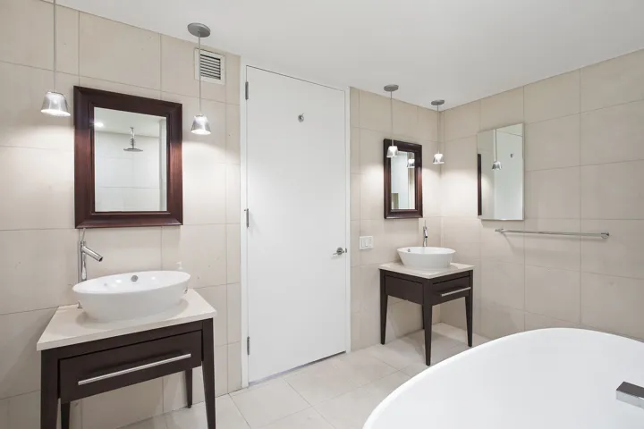 The beautiful oversized spa bathroom has double Duravit sinks, separate shower, and that gorgeous teacup bathtub.