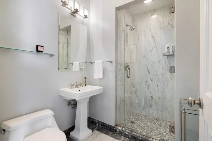 Just beyond, a secondary bedroom or flexible den/home office provides versatility for modern living. Completing the great room lies a full bath, elegantly appointed with a full marble glass shower and pedestal sink.