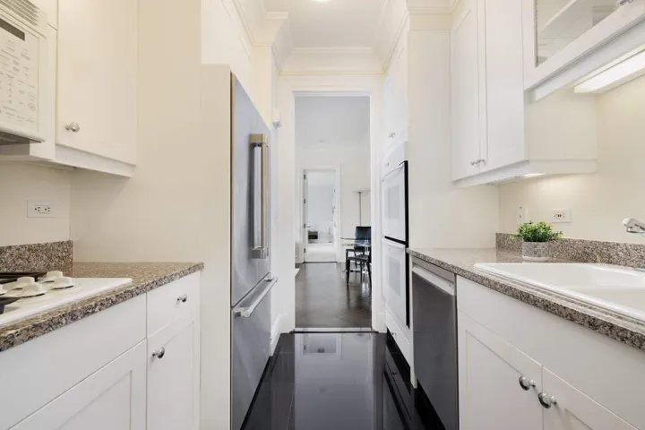 The chef’s kitchen is both chic and functional, featuring newly restored custom millwork, sleek granite countertops, and top-of-the-line Thermador and Bosch appliances. A discreet washer/dryer vents out, and ample storage completes the space with thoughtful convenience.
