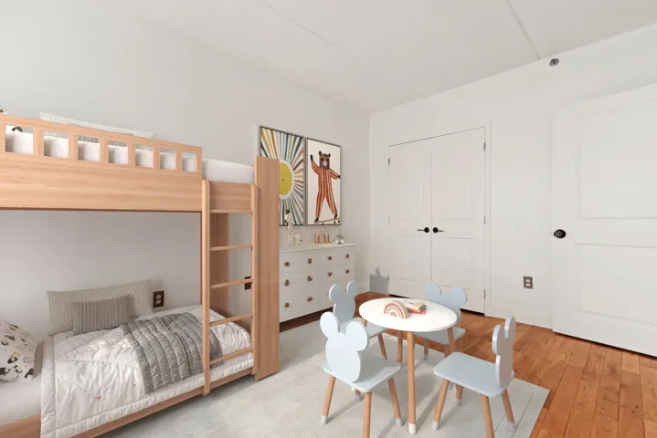 This unit is 797 square feet, has hardwood floors throughout, and large windows flood the space with natural light. The apartment overlooks the residents’ private landscaped outdoor space.