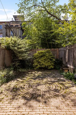 Ascend the stoop to a grand parlor level housing two generously scaled bedrooms and a home office with powder room-plus direct access to the backyard via interior stairs. Original details abound: pocket doors, intricate wall trim, hand-carved pediments crowning doors and windows, ceiling medallions, jewel-toned stained glass, and parquet floors bordered with decorative inlays. Outside, a fenced yard offers tranquility and versatility, complete with built-in cement benches, stylish pavers, and ample space for container gardens, outdoor dining, a fire pit, or a full grilling setup.