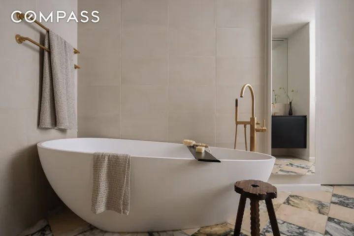 The primary suite is a sanctuary in its own right, framed by floor-to-ceiling windows and anchored by an oversized walk-through closet. Its spa-quality en-suite bathroom is clad in radiant-heated travertine and Calacatta Paonazzo marble, with a floating Rifra double vanity and a wet room featuring a soaking tub and dual rainfall showers. Additional bedrooms offer generous custom closets and share a designer-appointed bathroom with Dornbracht fixtures and a deep soaking tub.