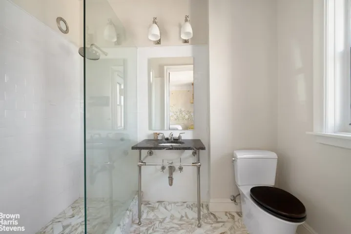 floors and a standing shower, and a second, hallway bath offers a contemporary