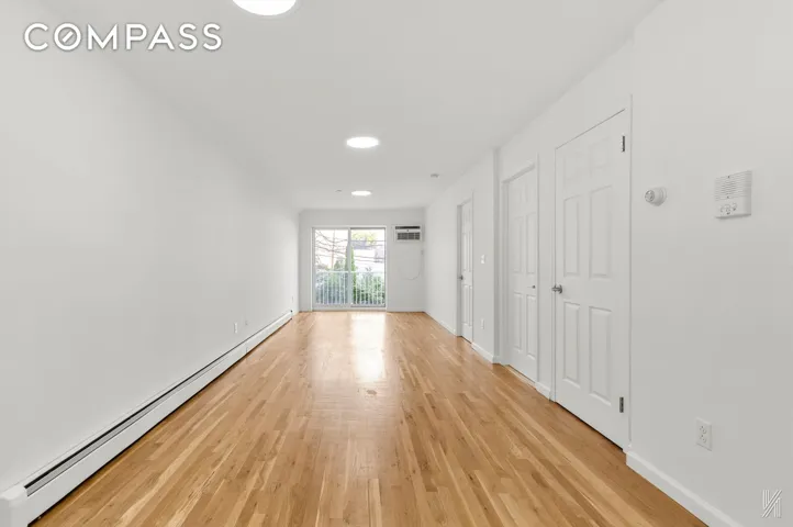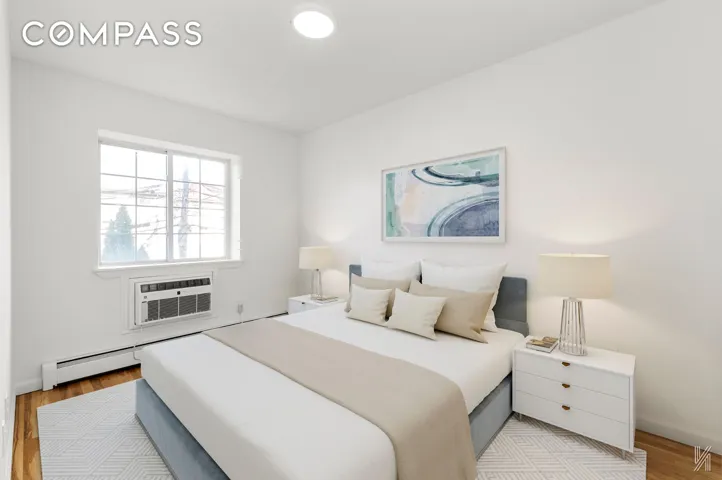 The bedroom, along with the living room, features a brand-new GE AC wall unit and overlooks the backyard and garden. It’s spacious enough to fit a queen-sized bed and includes a double-wide closet with sliding doors. The double-pane grille window comes with a deep windowsill, enhancing the room’s aesthetic.