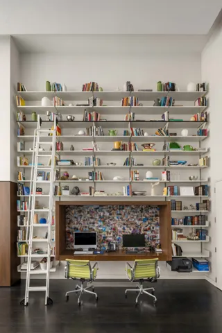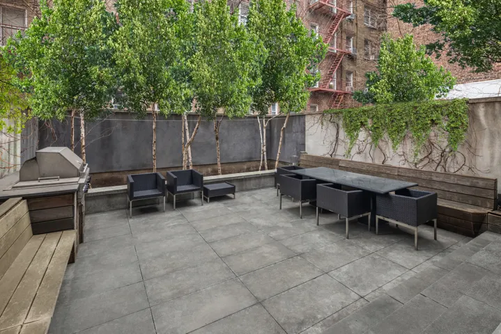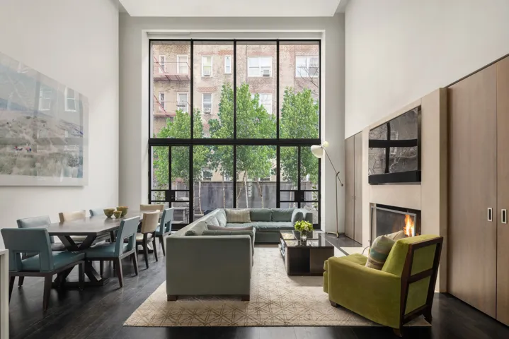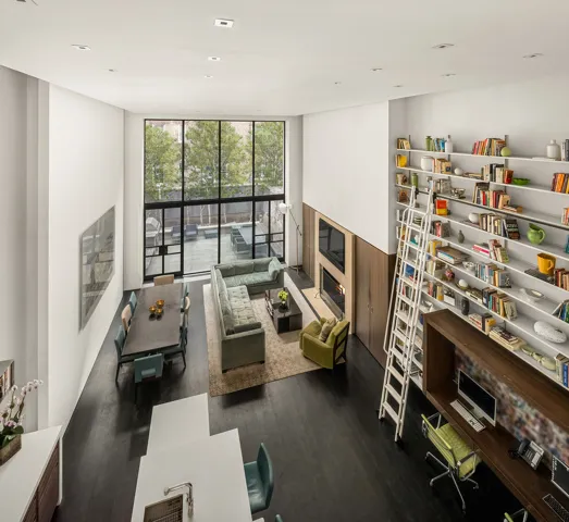 Ascending to the second floor via the architectural steel staircase, you are greeted by the media room, overlooking the double height great room and garden below. This level also features a grand living room with dramatic 18’6” ceiling heights, floor-to-ceiling windows and a marble fireplace, beautifully framed by wood paneling. On the third floor, an oversized bedroom suite opens onto a large, south-facing terrace. The ensuite bathroom is accessed through a dressing room, and features custom herringbone and subway tiling. A wall of custom closets and a separate walk-in closet complete this third floor suite.