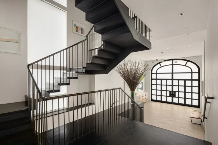 Entering the home, you are ushered into a spacious foyer framed by beautifully restored carriage house doors. Up a few steps, the enormous great room unfolds with double height ceilings up to 20’ feet and is framed by a wall of windows opening onto the garden. A state-of-the-art chef’s kitchen boasts a suite of appliances by Wolf, SubZero and Bosch, a generous Caesarstone center island/breakfast bar and custom-built cabinetry. A large mudroom and discreet powder room round out the garden level floor.