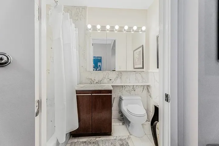The corner bedroom, with exposures north and west, is highlighted by a stunning custom Murano chandelier and offers space for a dedicated home office. Ample closet storage and recently updated HVAC systems (within the last 3 years) add comfort and functionality. The Carrara marble bath features a deep soaking tub, large vanity, and new mirrors.