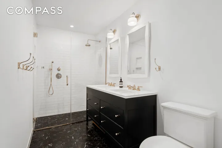 The serene primary suite includes a walk-in closet and spa-inspired bath with marble finishes, a custom double vanity, and Waterworks fixtures. A spacious second bedroom and full guest bath provide flexibility for family, guests, or a home office. With generous closet space and an in-unit Bosch washer/dryer, the home blends convenience with design.
