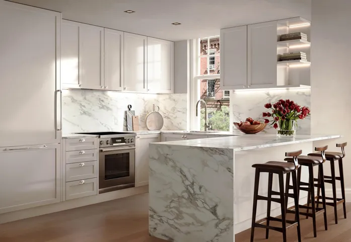 An entry foyer and adjacent coat closet provides a warm entry point to the home. An original decorative fireplace provides a charming focal point to the gracefully proportioned living room beyond. West facing windows permeate the living space with natural light and highlight the charming Greenwich Village cityscape beyond. The oversized windowed kitchen, open to the living room, is impressively outfitted with slim shaker cabinetry with under-cabinet lighting, honed Bianco Carrara marble countertops and backsplash, a stainless-steel Bosch induction/convection range/oven, integrated Bosch refrigerator / freezer and dishwasher, and polished nickel fixtures.