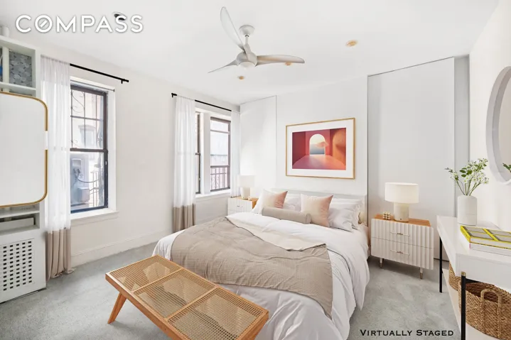 The well-conceived split bedroom layout ensures privacy and flexibility. The primary suite includes a private dressing area and an en-suite bathroom. The full bathroom features a stacked washer and dryer, while the fourth bedroom is discreetly situated behind the kitchen alongside a useful office nook. Just 2 flights up, this home is a perfect canvas awaiting your vision. The unit comes with a storage unit.