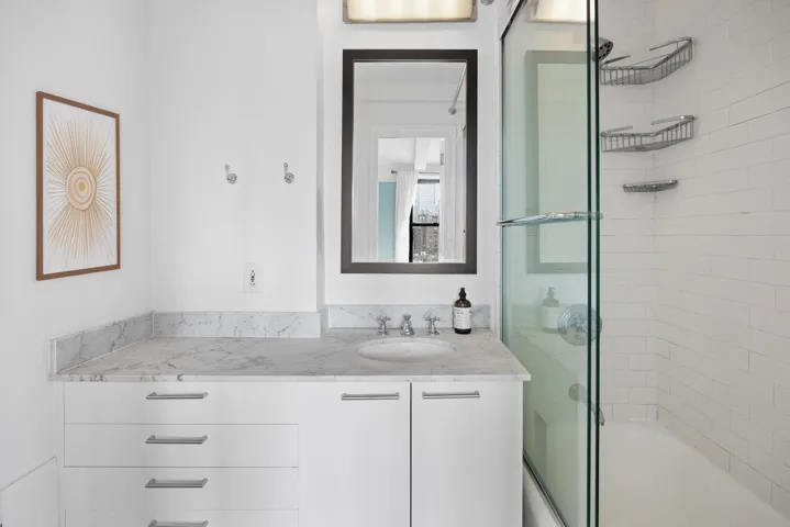 Both the elegant living room and sun-flooded bedroom of this lovely prewar home offers breathtaking open south city views from big picture windows. The renovated windowed bathroom is en-suite, and the kitchen also has a window as well as marble countertops, stainless steel appliances, and opens to a dining area.