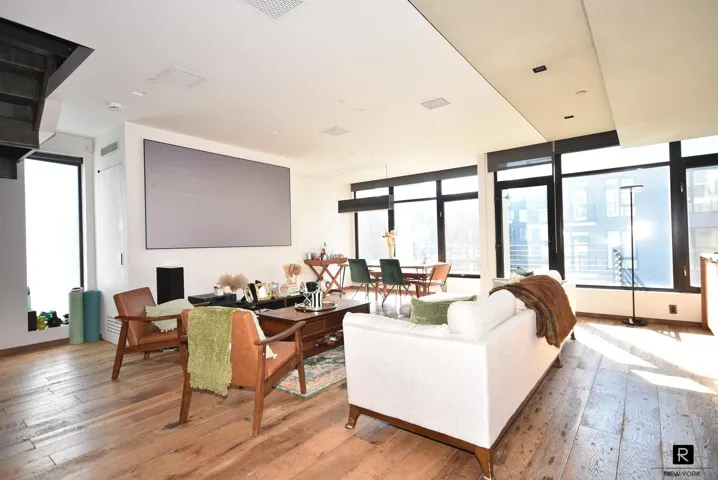 Accessed thru a centrally located keyed elevator the opens into a beautiful entry foyer. To the right side is the living/entertaining area with a wall of west-facing floor-to-ceiling windows. The flooring throughout is crafted from reclaimed 19th century oak beams. Featuring an open floor plan seamlessly allowing separate dining, living, kitchen, west-facing balcony and office area. There is a separate bar area that serves as an entertainment station for cocktails and—underneath—a pet food and drink area. A ceiling mounted projector provides a screening room experience, and one of two home offices is divided by vertical walnut slats. Under the office desk is clever storage of a Japanese futon, providing a place to rest for overnight guests.