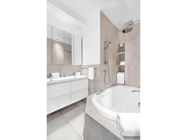 The 2nd Bedroom is a large pin drop quiet room with a build out closet, high ceilings and windows facing the inner courtyard. 2nd Bathroom also windowed with natural ceramic tiles, and a generous glass stall shower with full body jets.