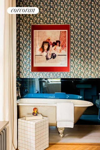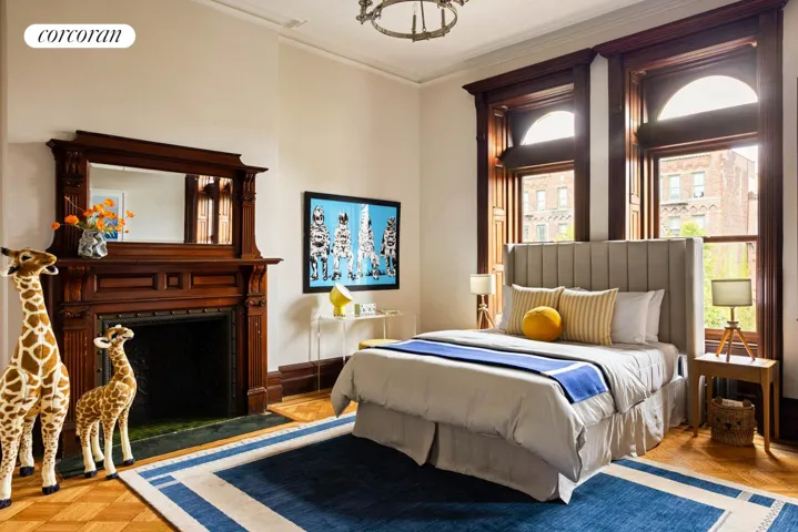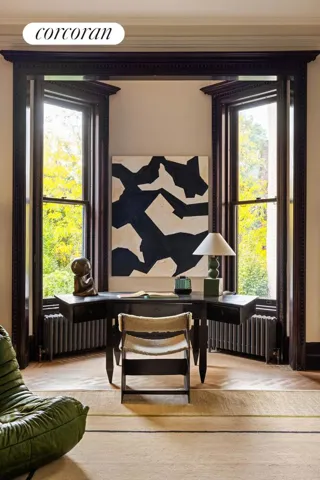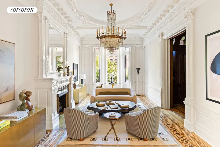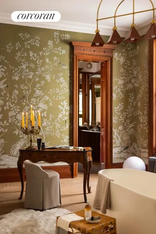 Spanning roughly 10,000 square feet over five stories, the layout offers seven bedrooms and six full bathrooms (plus additional half baths) across its elegant wings. The parlor level, stretching about 105 feet deep, hosts formal living and dining salons, a generous sitting room, and a chef’s kitchen enlivened by a rear extension of curved glass and custom copper roofing. The upper floors accommodate the principal suite, multiple ensuite bedrooms, a library or study, and gracious secondary rooms.