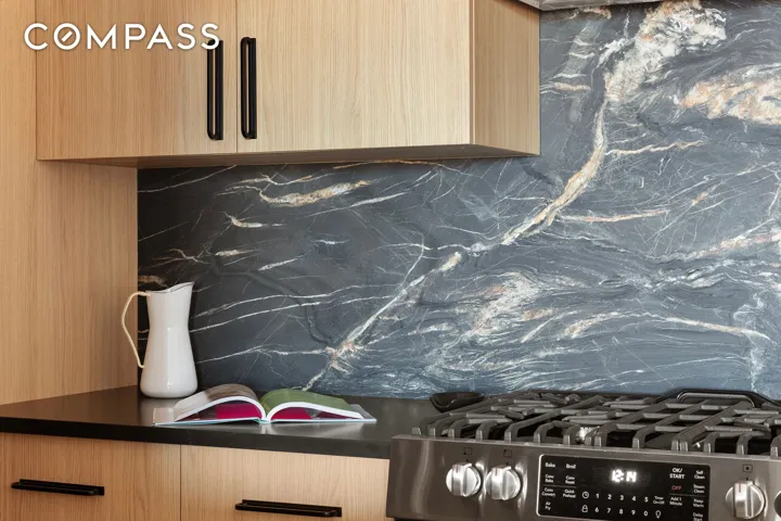 The wonderful sense of space makes an instant impression the moment you walk through the door into the expansive and versatile 30-foot living area. The apartment was thoughtfully renovated in 2022-23, including the addition of recessed overhead lighting. Originally closed off by a doorway, the kitchen was opened up during the renovation, creating a seamless flow into the living/dining space, making it perfect for both cooking and entertaining. The beautiful backsplash is solid marble, while the quartzite countertops provide exceptional durability and heat resistance. The kitchen offers plenty of storage in chic cabinetry, and is outfitted with stainless steel appliances including a dishwasher and wine cooler.