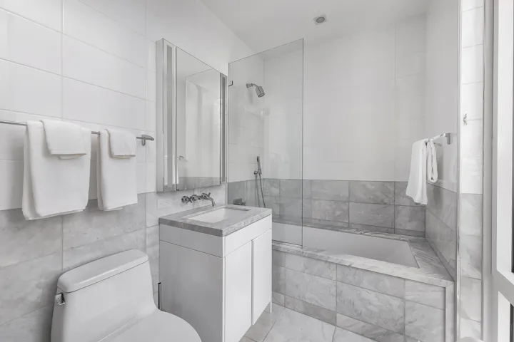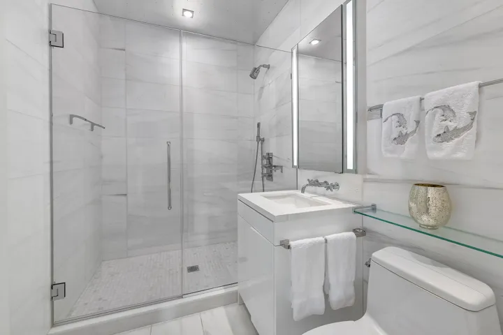 Refined details include Italian marble bathrooms with Lefroy Brooks fixtures, wide-plank white oak flooring, four-zone central HVAC, and radiant heated floors.