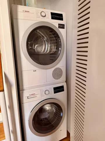 A windowed chef’s kitchen has been fully renovated with top-of-the-line appliances, including a Viking range, Sub-Zero refrigerator, Bosch dishwasher, and sleek Poggenpohl cabinetry paired with black granite countertops. Additional highlights include hardwood floors throughout and an in-unit washer/dryer for ultimate convenience.