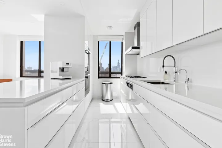 Spanning 1,254 square feet, this 2-bedroom, 2.5-bath residence has been meticulously gut-renovated in collaboration with a renowned architect, blending European sophistication with modern convenience. The open-concept living space is framed by Porcelanosa Carrera porcelain flooring, chosen for both durability and refined style. Expansive low-E double-pane windows enhance the panoramic views while reducing noise and UV rays, ensuring a serene atmosphere throughout the day. At the heart of the home lies a fully customized Poggenpohl kitchen, imported from Germany in glossy white, anchored by a central island and topped with Silestone Eternal Statuaria Quartz, the kitchen is outfitted with a complete suite of top-tier Miele appliances: two large refrigerators, two ovens (including a steam combo), cooktop, hood, dishwasher, and in-unit washer/dryer.