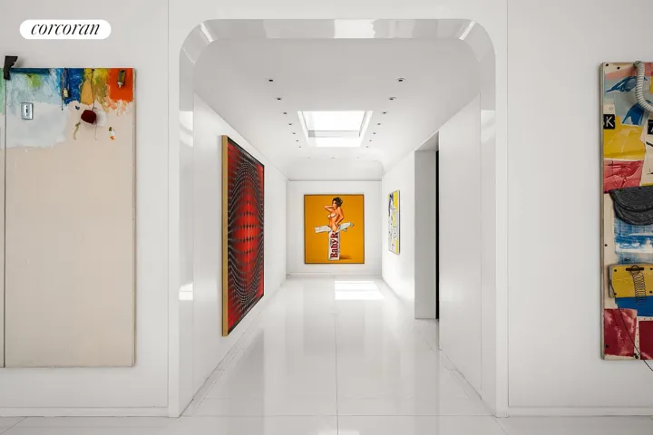 Enter through one of two private elevator landings into a dramatic skylit gallery, which sets the tone for the scale and grace of the home. The expansive living room-with its curved walls of windows framing river and skyline views-anchors the entertaining wing, alongside a richly appointed library with wet bar, an elegant formal dining room, and a streamlined chef’s kitchen with direct terrace access. These spaces are designed to host gatherings both intimate and grand, with gallery-grade lighting and finely integrated systems that allow art, design, and daily life to coexist effortlessly.