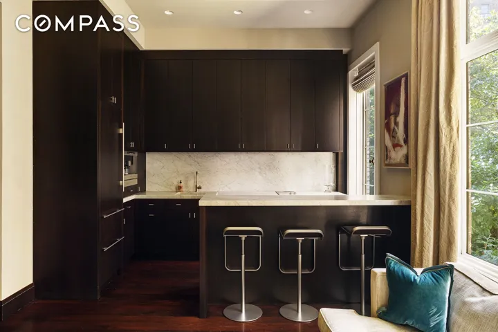Inside the 5,336-square-foot townhouse, tall ceilings with recessed and designer light fixtures soar above hardwood floors, seven wood-burning fireplaces and updated extra-tall windows. A classic high stoop flanked by exquisite ironwork ushers you into the main entertaining level, where a large living room wrapped in custom built-ins flows to a formal dining room and a sitting room flanked by a convenient midnight kitchen. A powder room and coat closets complete the well-planned level.