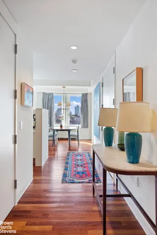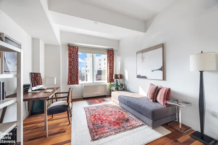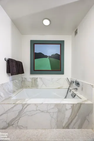 The expansive layout begins with a grand entrance foyer, anchored by ample closet space, a laundry room with vented washer-dryer, and a full bathroom with steam shower. The open corner living-dining-den area has private media and/or guest room nook and kitchen area measuring a total of 27′ by 27′. The semi-open kitchen, with oversized pantry closet added, is outfitted with custom cabinetry, quartz countertops, and top-tier appliances, including a 36″ Viking Professional Series range with a vented hood, a Bosch dishwasher, and a Sub-Zero refrigerator. The floors are wide-plank Brazilian hardwood in impeccable condition. The residence is pin-drop quiet with double pane windows and extra soundproofing by Citiquiet windows. The generously proportioned primary suite is a luxurious retreat, featuring an en-suite bath with separate steam shower and bath as well as multiple large and walk-in closets all customized for maximum storage and efficiency. The second bedroom, also with its own en-suite bath and ample closets, offers comfort and privacy. The three bathrooms, epitomizing style and function, are appointed with marble finishes and fixtures from Toto and Kohler.
