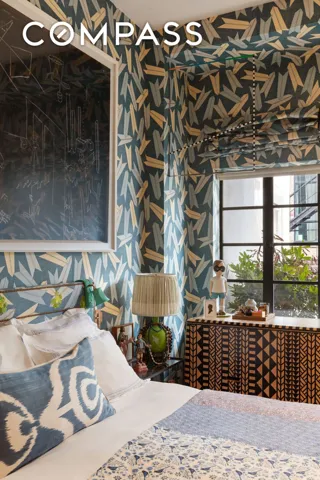 Dеsіgned by AD 100 Design Firm RP Miller, this eclectic home has been transformed from great bones to great design. A high bar is set upon entering the dramatic Gallery with 13’ ceilings and floor to ceiling oak closets offering plentiful storage + a view into the open cook’s kitchen equipped with a Samsung stove, Bosch oak paneled refrigerator and DW and custom oak cabinets with stainless steel and Black Corian countertops. The gallery flows into the light filled south-facing open Living/Dining room with soaring ceilings, arched windows, RP Miller designed built-in L-shaped sofa and custom-fabricated rolled carbon steel library shelving designed by Gabrielle Shelton. At the other end of the Gallery blackened steel casement doors invite you into the second bedroom, currently utilized as an office/guest room with casement windows and double doors leading to the apartment’s private north-facing terrace, a perfect place for al fresco entertaining. The walls and windows of the primary bedroom are covered with fabric designed by RP Miller creating a warm and intimate chamber. Both bathrooms were designed as an art installation by Max Lamb and are clad from floor to ceiling in Lamb’s Marmoreal Terrazzo. Floors throughout the loft are stained concrete, complimenting the industrial vibe of this one-of-a-kind home.