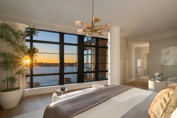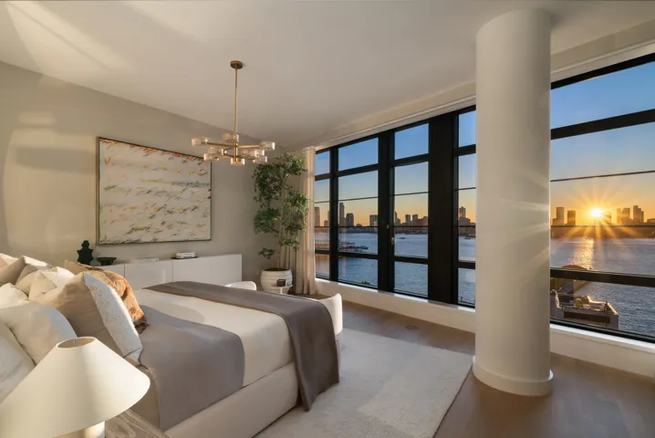 The primary suite is a sanctuary in the sky, with dazzling river and skyline views that shift with the light and mood of the day. A window-wrapped sitting room offers a serene retreat for quiet reflection or focused thought, while the five-fixture marble bath features a deep soaking tub, double vanity, and exquisite LeFroy Brooks fittings.