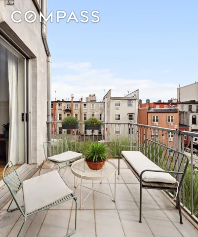 This fully renovated, 2-bed, 1.5-bath duplex on the border of Clinton Hill and Bed-Stuy offers a sun-drenched space with open views and a south-facing private terrace.