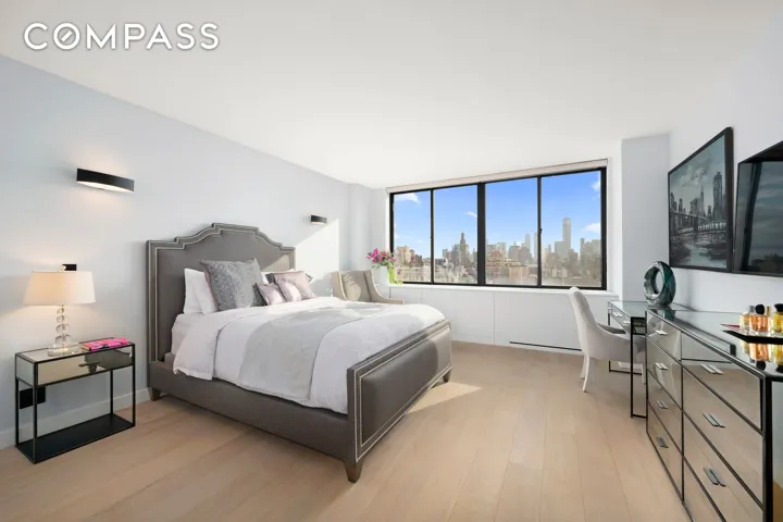 Perched way up on the 19th floor, this mint condition, stunning two-bedroom, two-full bathroom condominium with wood burning fireplace and a private terrace offers refined elegance and breathtaking unobstructed city views spanning from New Jersey to Brooklyn.