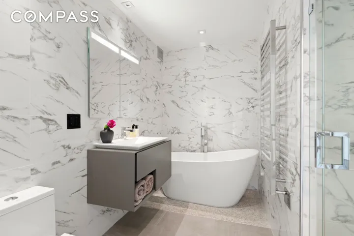 The oversized primary suite easily accommodates a king bed and boasts a spacious California Closet. Its spa-like en suite bath showcases Calacatta marble, Porcelanosa fixtures, a frameless glass-enclosed shower, gorgeous separate soaking tub, and towel warmer. The sun-filled spacious second bedroom offers abundant closet space and open views, complemented by a beautifully finished second bathroom with stall shower.